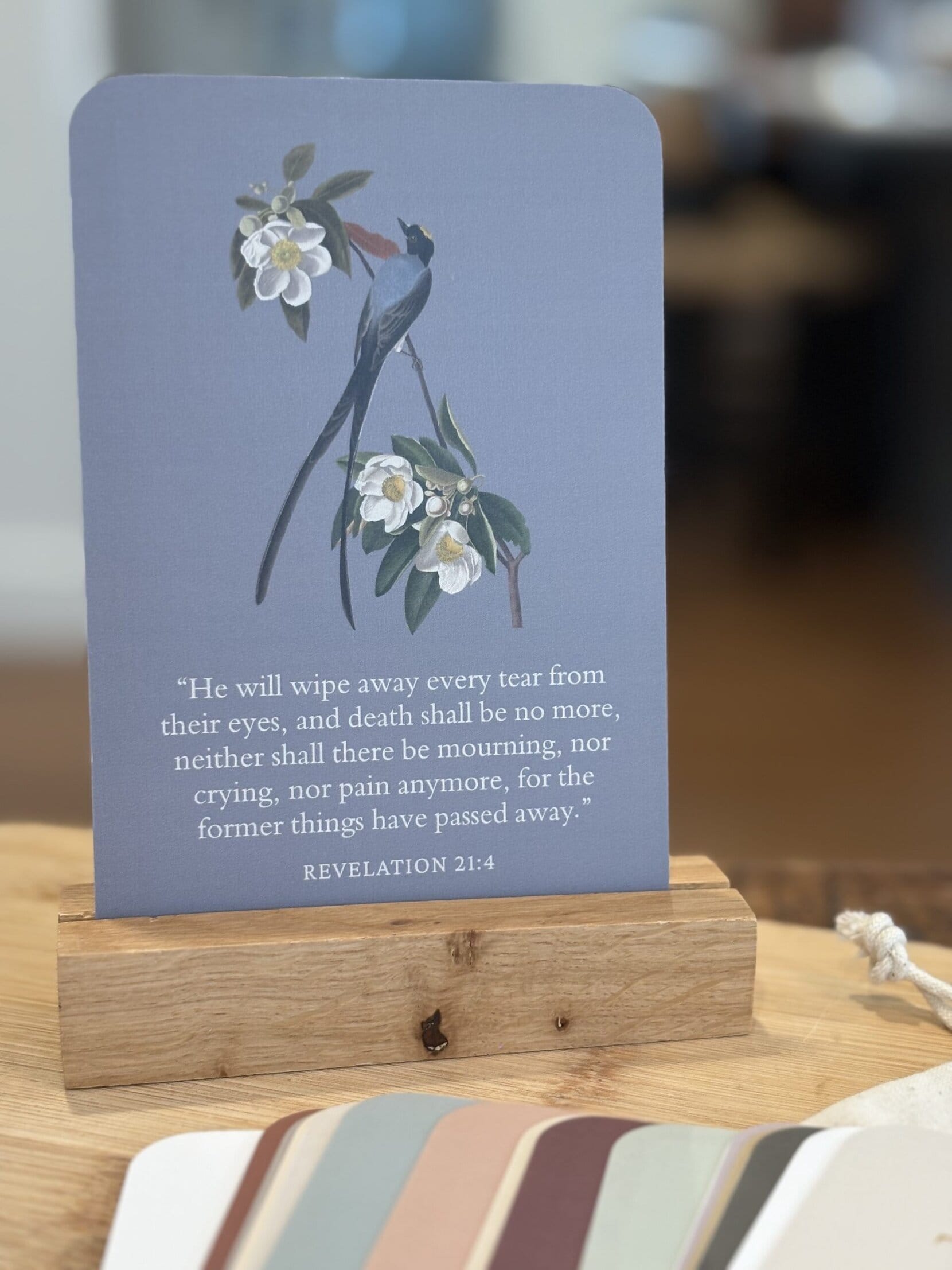 Materials: Heavyweight matte cardstock, natural wood display block, cotton drawstring pouch