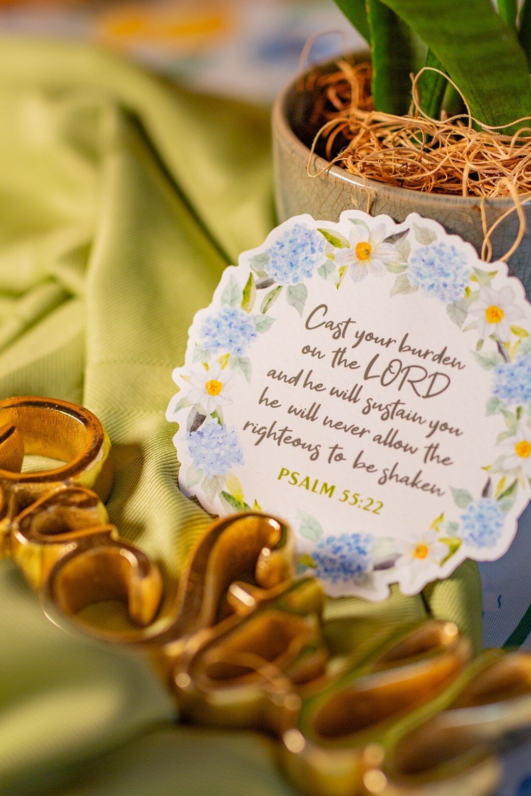 Design: Hand-lettered Psalm 55:22 with a soft, calming illustration